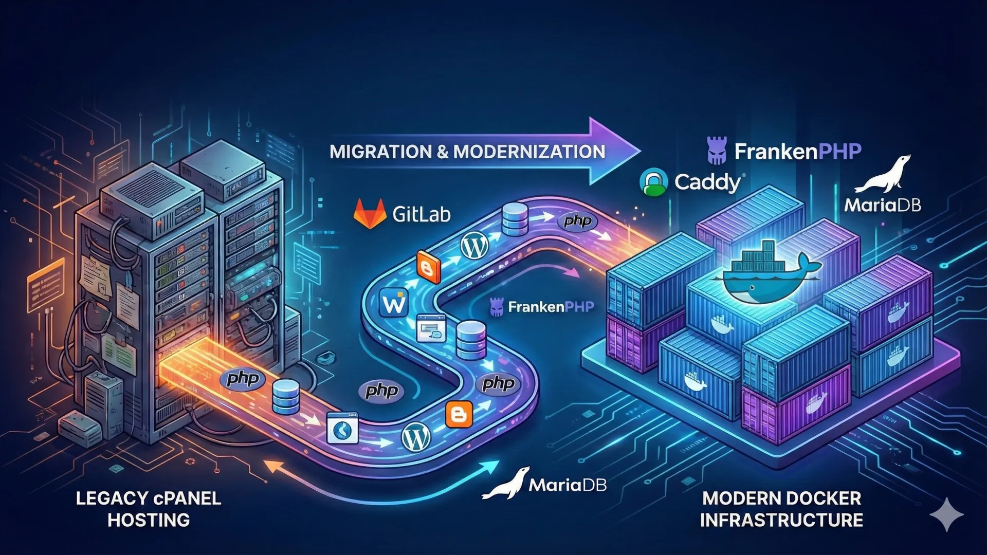 A comprehensive case study on modernizing infrastructure: moving 50+ PHP applications from shared hosting to a scalable, containerized VPS environment using FrankenPHP, Caddy, and GitLab CI/CD.